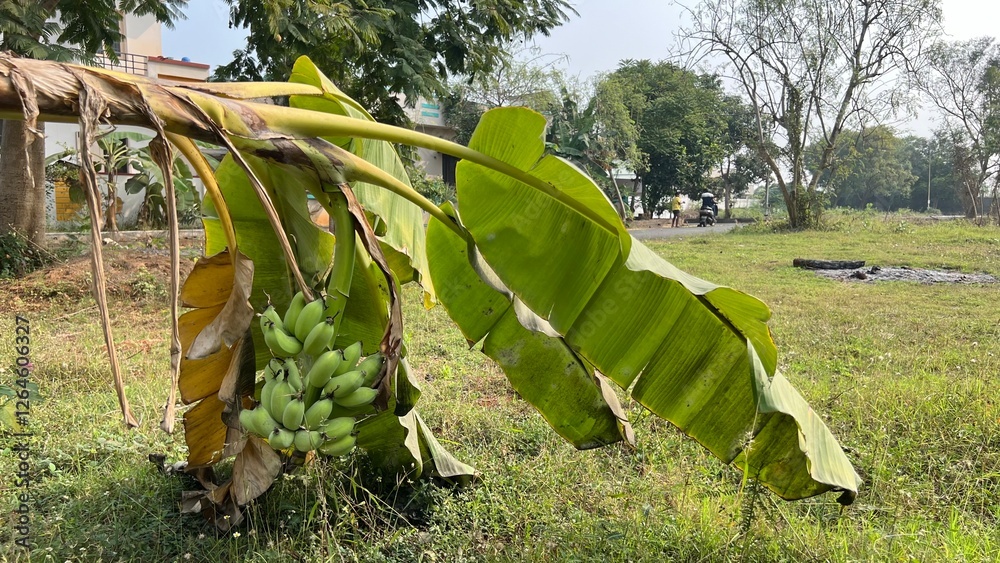 Unripe Bananas on a banana tree in the garden, a fruiting banana tree with green leaves in the background, Raw cluster of bananas. Bananas in the jungle.Banana leaf backgrounds.