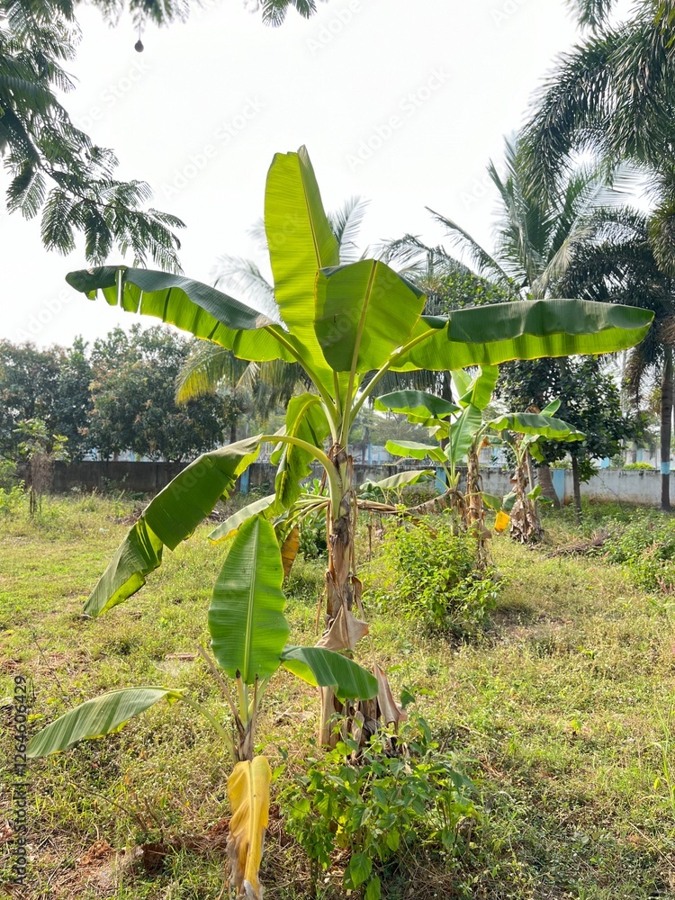 Unripe Bananas on a banana tree in the garden, a fruiting banana tree with green leaves in the background, Raw cluster of bananas. Bananas in the jungle.Banana leaf backgrounds.