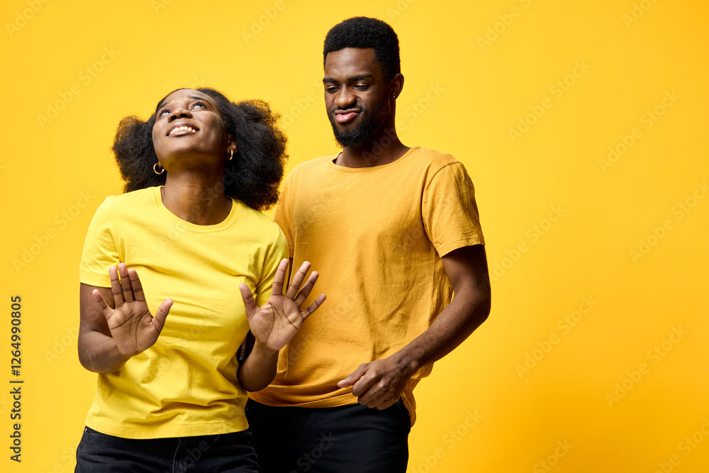 Happy African American couple dancing in bright yellow clothing against a vibrant yellow background, expressing joy and carefree emotions