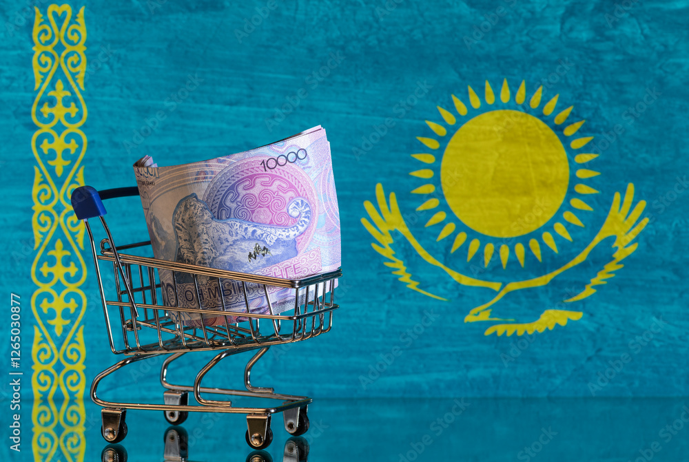 A 10,000 Kazakh tenge banknote in a miniature shopping cart in a photo of the Republic of Kazakhstan flag