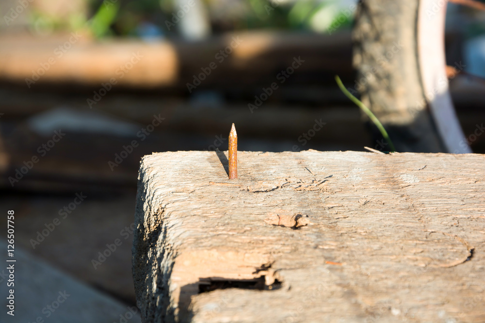 BE CAREFUL WITH THE NAIL !! ,PERFORATED OLD WOOD , BLURRY BACKGROUND