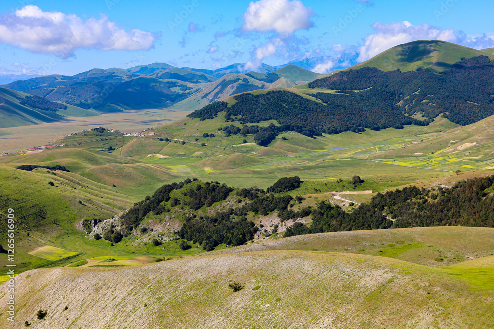 Paesaggio del Parco Nazionale dei Monti Sibillini, tra Marche e Umbria, in una soleggiata giornata di inzio estate, Italia