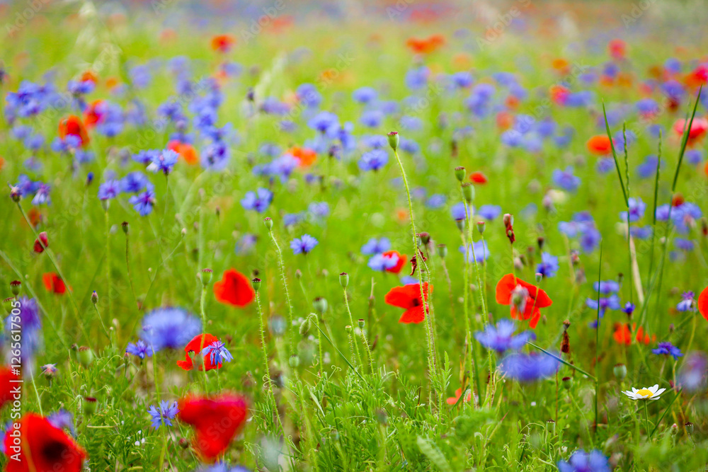 La coloritissima fioritura dell'altipiano di Castelluccio di Norcia nel Parco Nazionale dei Monti Sibillini, Umbria, Italia, in una soleggiata giornata estiva