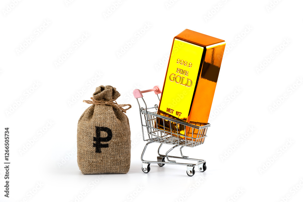Gold bar in miniature shopping cart and money bag with Russian ruble symbol
