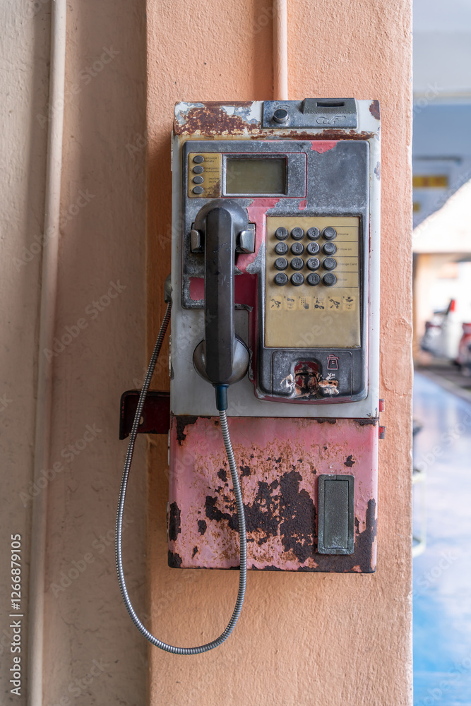 An abandoned nostalgia payphone on the wall evokes a sense of time passing and a world moving away from older technologies.