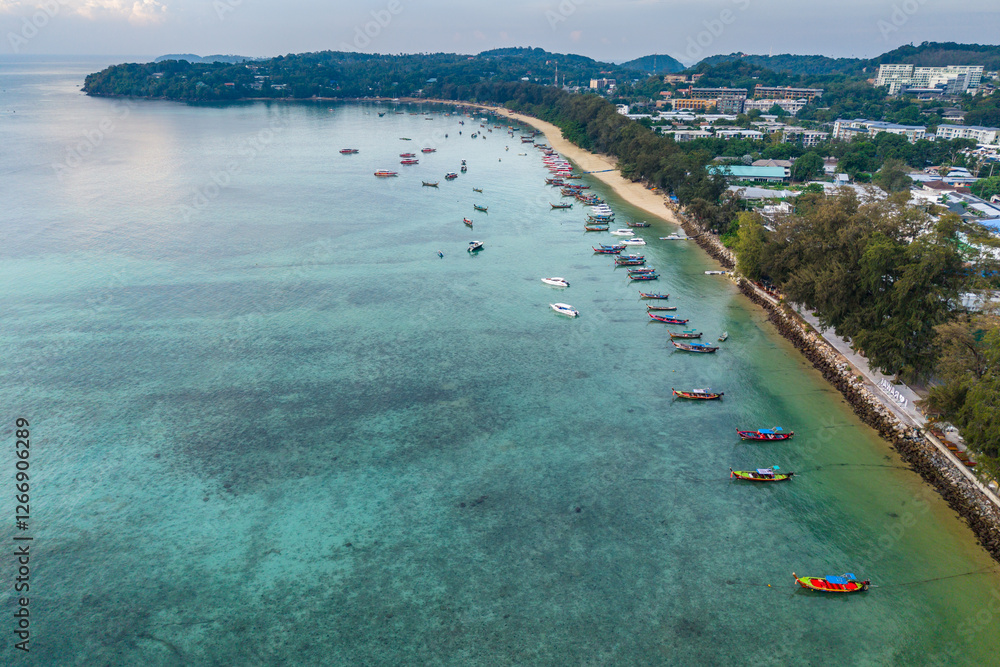 Aerial view of Rawai Beach, Phuket, Thailand, with longtail boats moored in the turquoise water.