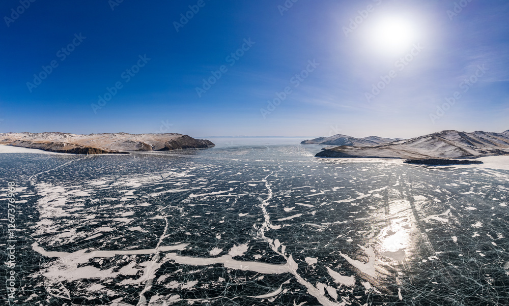 Aerial top view to Blue clear ice lake Baikal. Crack covered snow on frozen water surface. Cold winter landscape with mountains, sunny day, Natural background. Small Sea, Olkhon Gate, Russia, Siberia.