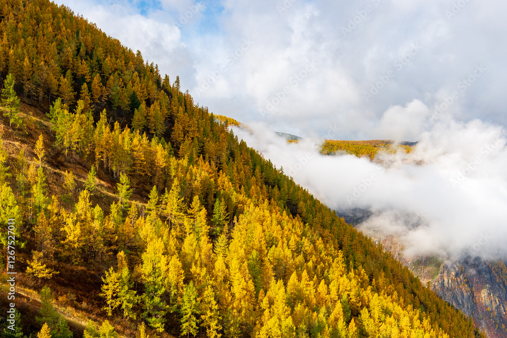 Picturesque view of the mountain slope with autumn forest and fluffy clouds. Altai Mountains, Katu-Yaryk pass.
