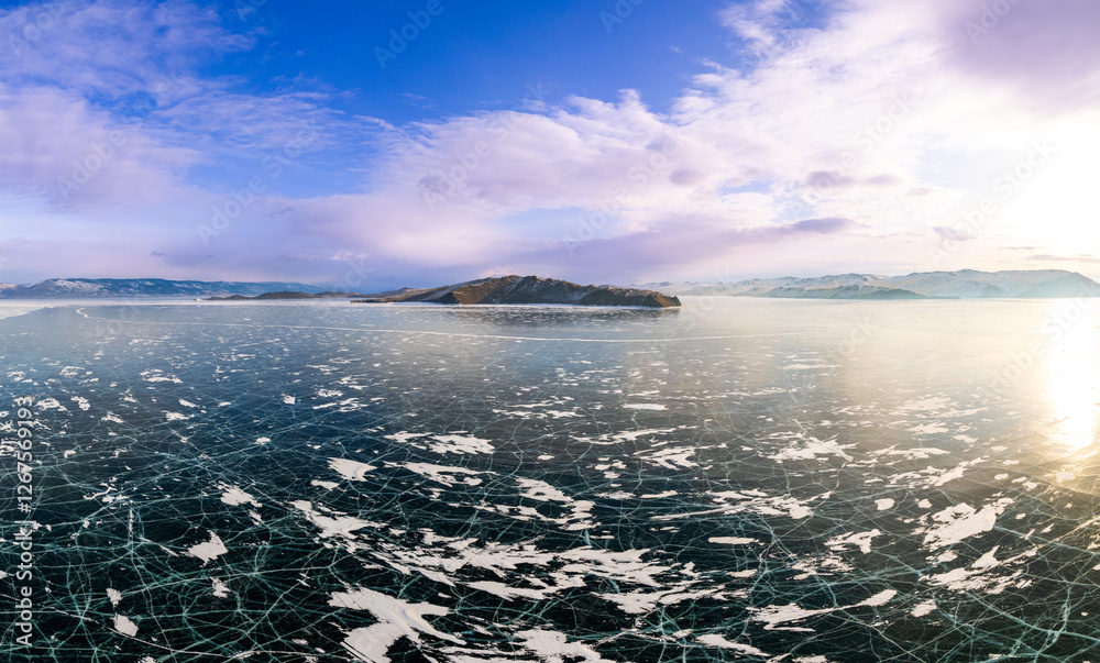 Aerial top view to Blue clear ice lake Baikal. Crack covered snow on frozen water surface. Cold winter landscape with mountains, sunny day, Natural background. Small Sea, Olkhon Gate, Russia, Siberia.