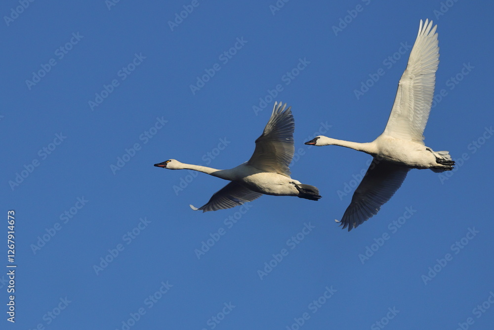 Flying tundra swans against blue sky.