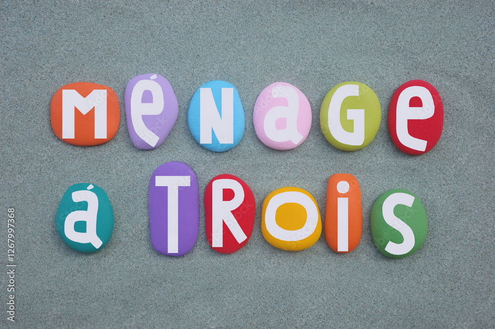 Menage a trois, phrase is a loan from French meaning household of three, creative text composed with multi colored hand painted stone letters over green sand