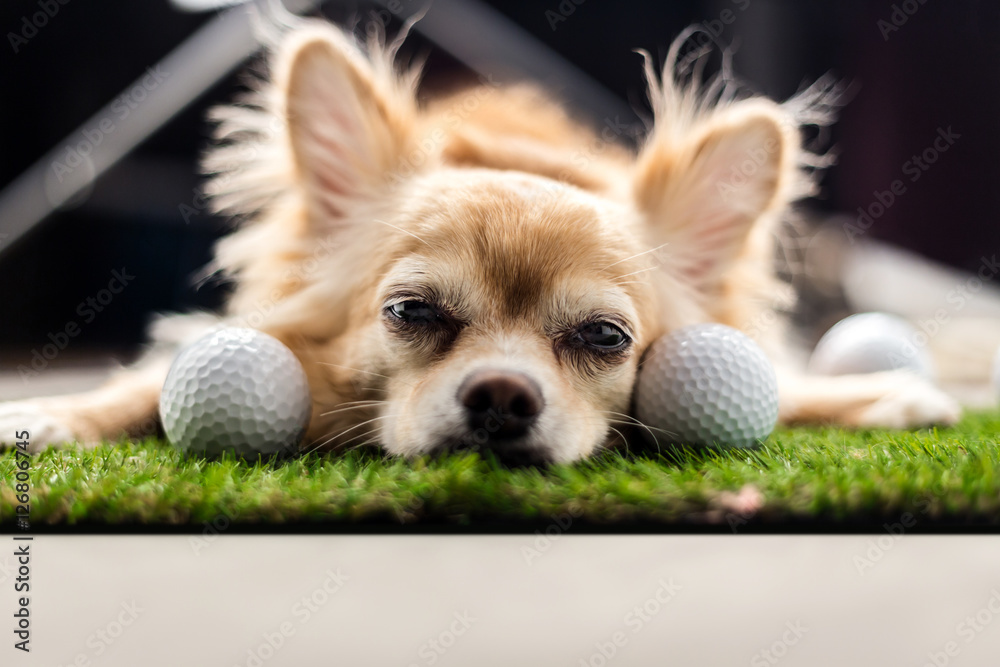 chihuahua dog brown color sleeping next to golf ball on green gr