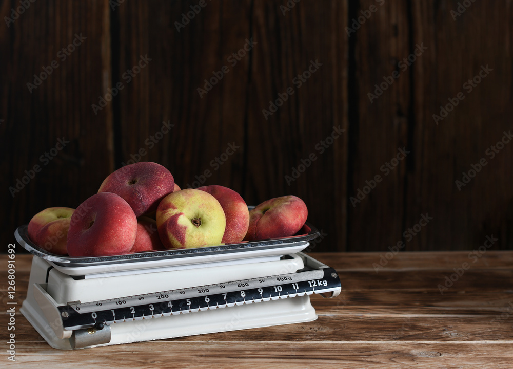 Weighing ripe flat peaches on vintage metal kitchen scales on wooden background highlighting their rustic style and coziness,