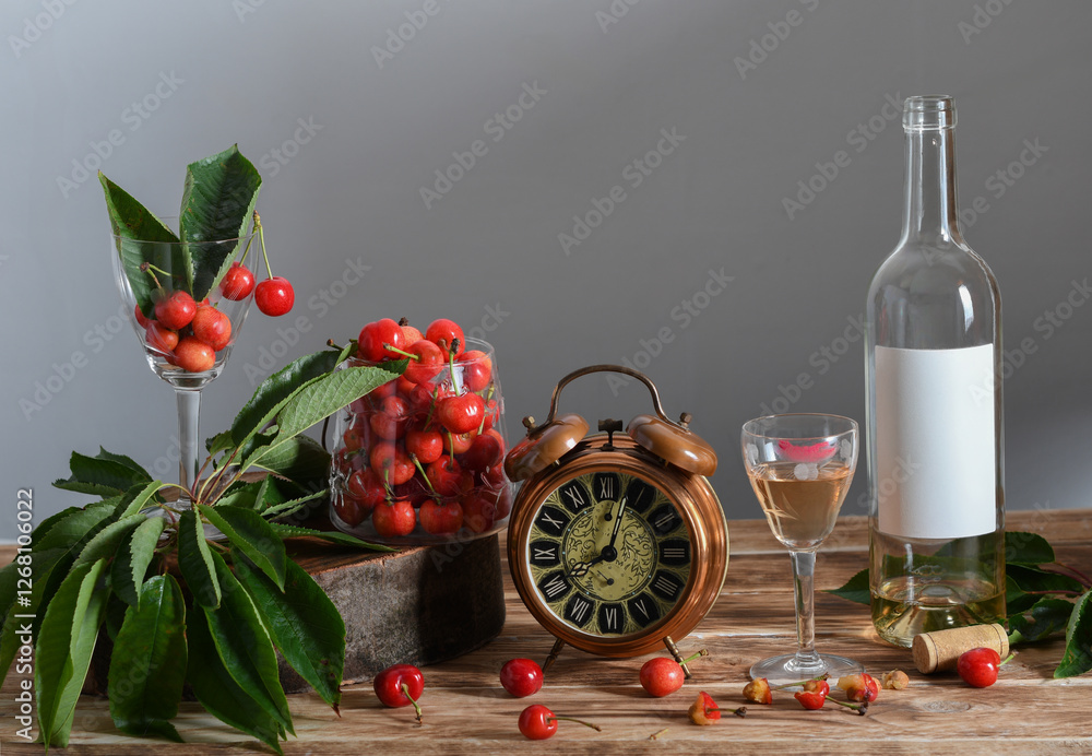 Fresh cherries spill out of jar next to a bottle of rose wine, partially filled glass with lipstick marks and a vintage alarm clock, creating a summer still life on a rustic wooden table,