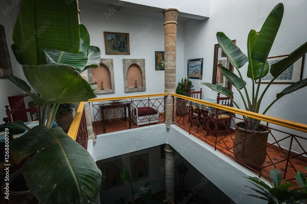 Internal yard of the old Riyad house with flowers decoration and white walls in Essaouira Morocco