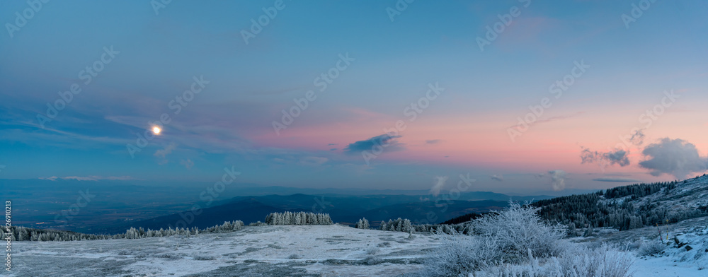 Amazing pink purple winter sunset in the mountains - beautiful frozen landscape - moon rising panorama