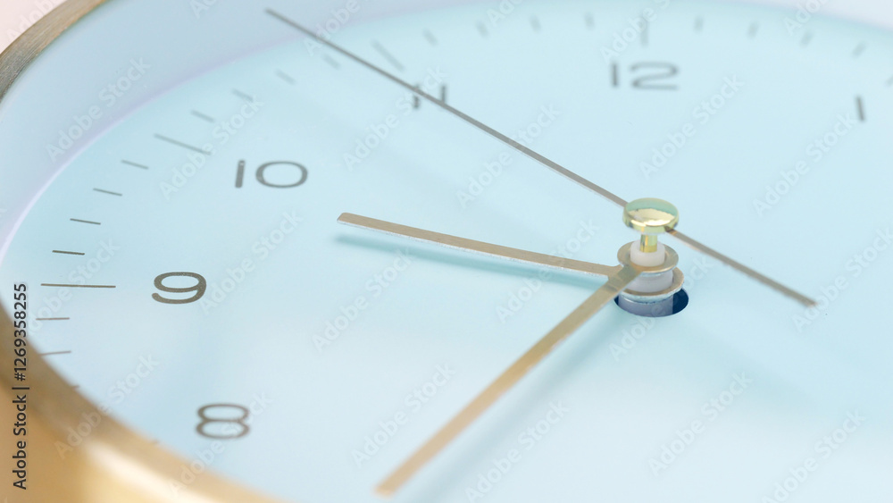 close-up of a modern wall clock with a light blue face and gold-toned hands.