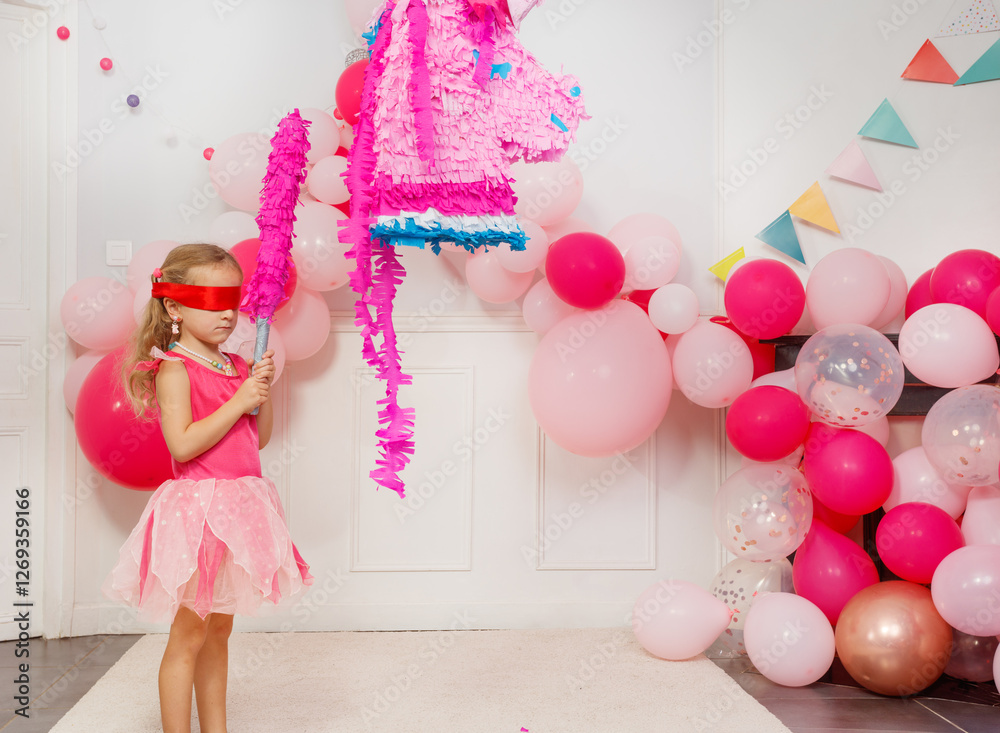 Girl puzzled at a party, stand blindfolded in front of pinata