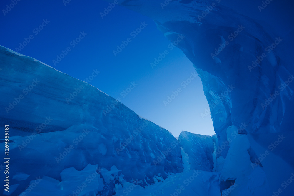 Narrow passage created by nature with towering ice on both sides