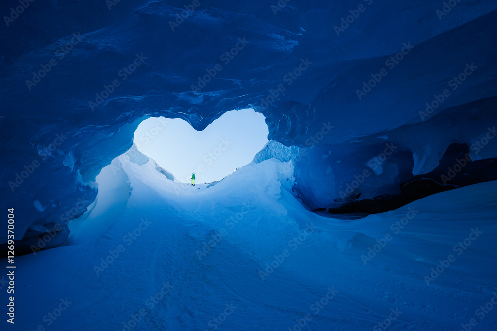 Ice cave with heart-shaped entrance offer view of a clear sky