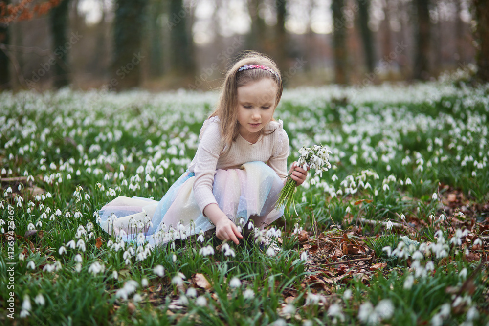 Cute preschooler girl in tutu skirt gathering snowdrop flowers in park or forest on a spring day. Little kid exploring nature. Outdoor activities for children.