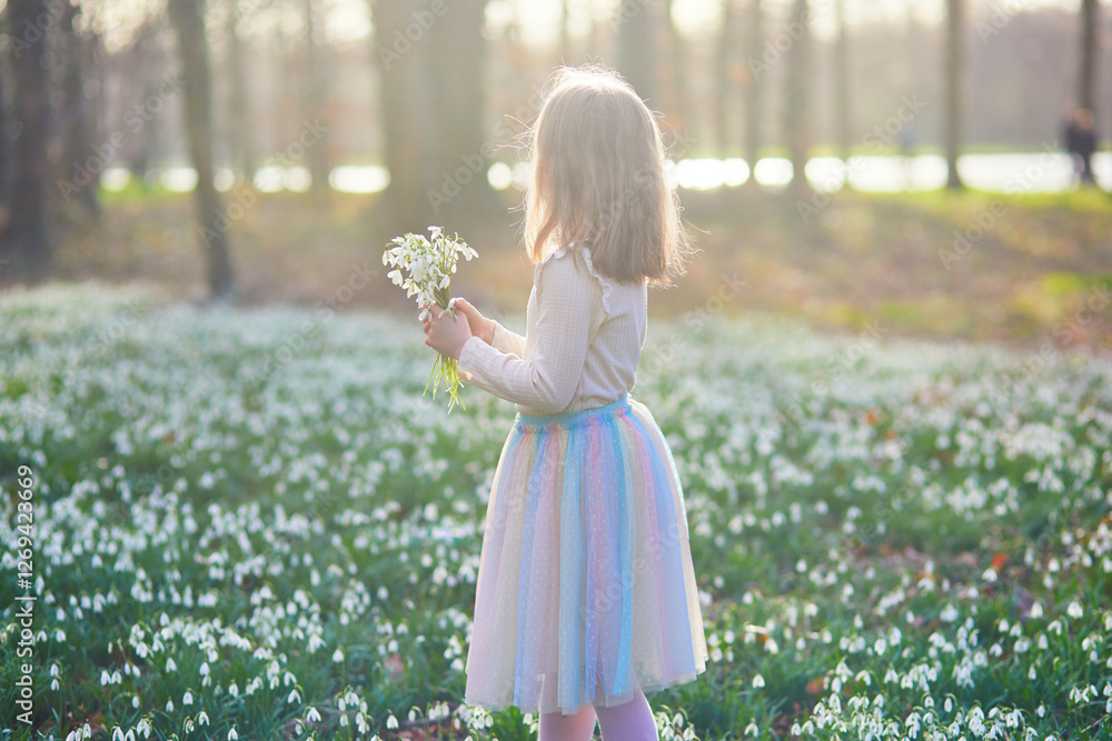 Cute preschooler girl in tutu skirt gathering snowdrop flowers in park or forest on a spring day. Little kid exploring nature. Outdoor activities for children.
