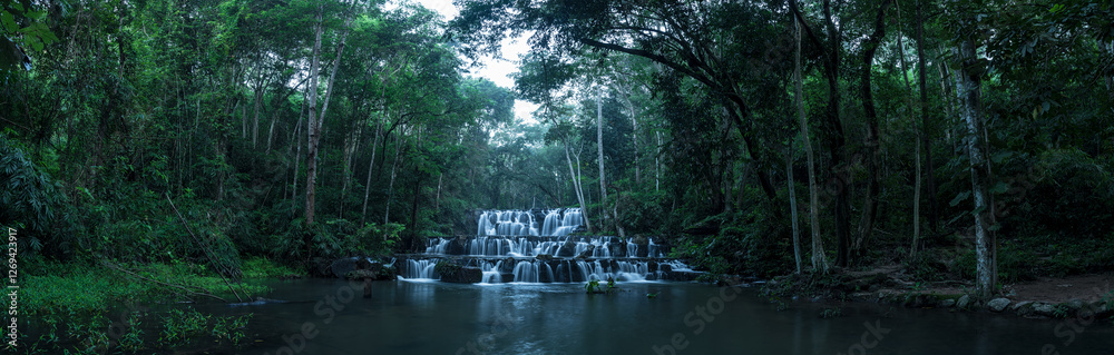 Panoramic beautiful deep forest waterfall in Thailand. nature background.