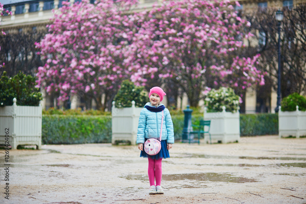 Adorable preschooler girl enjoying pink magnolias in full bloom on a rainy day in a park of Paris, France