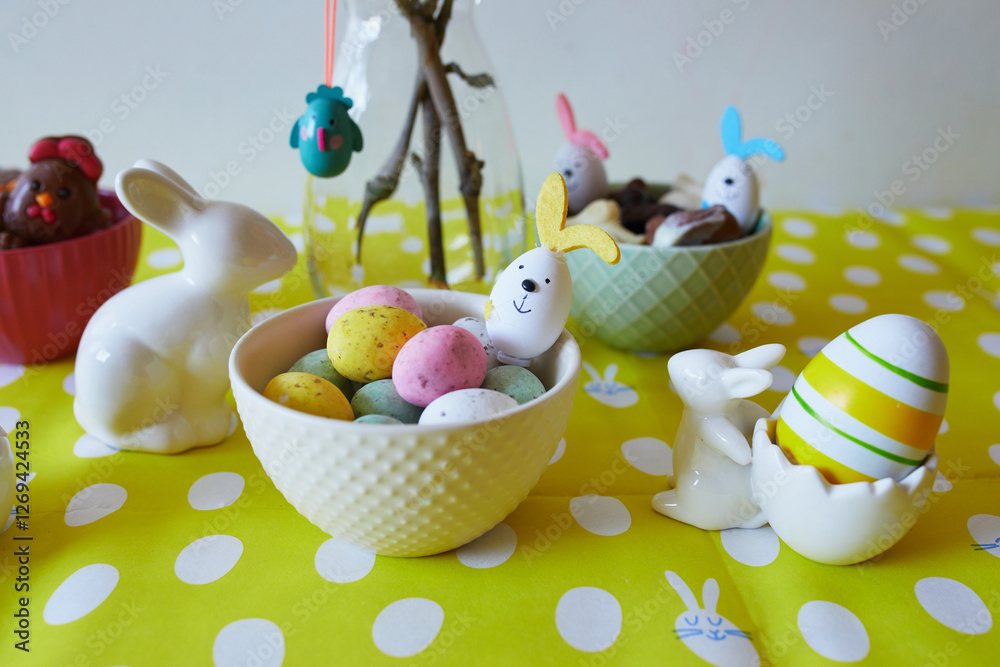 Beautiful Easter table decorated with colored eggs, rabbits, chickens, delicious sweets and chocolates served for festive breakfast on Easter.