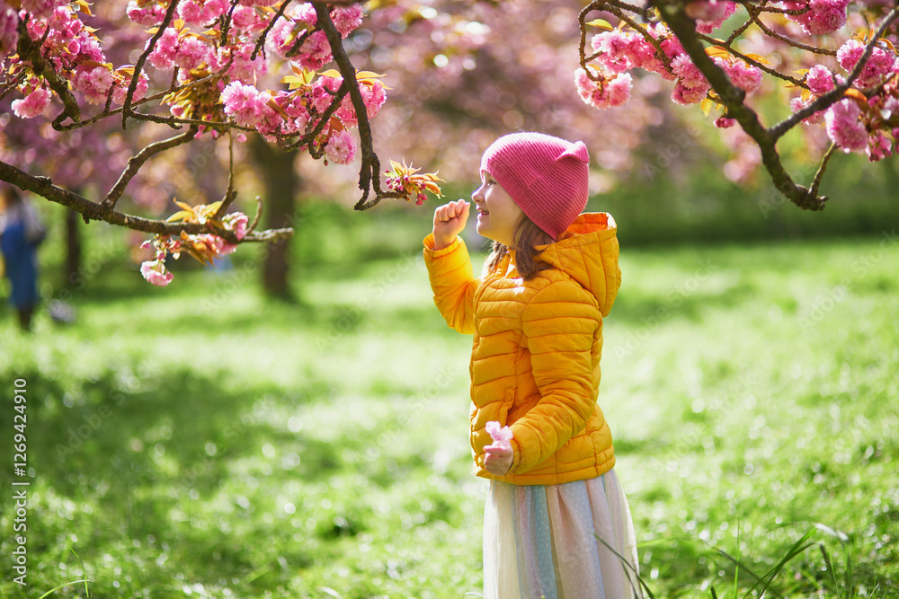 Adorable preschooler girl enjoying nice spring day in cherry blossom garden.