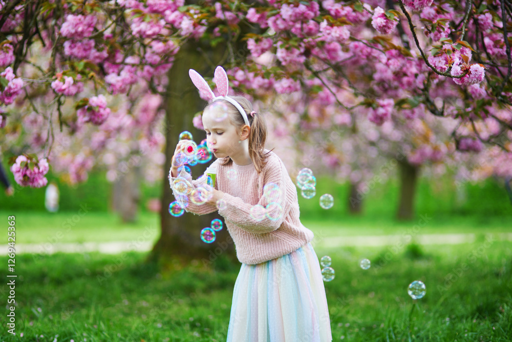 Adorable preschooler girl wearing bunny ears blowing bubbles and enjoying nice spring day in cherry blossom garden.