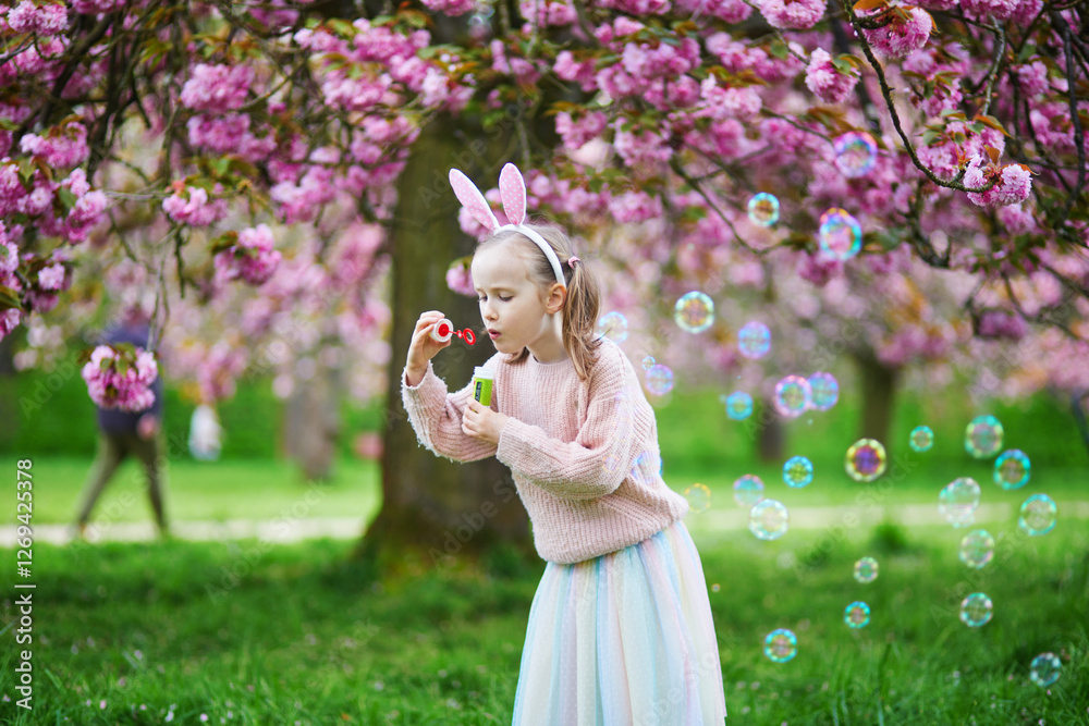 Adorable preschooler girl wearing bunny ears blowing bubbles and enjoying nice spring day in cherry blossom garden.