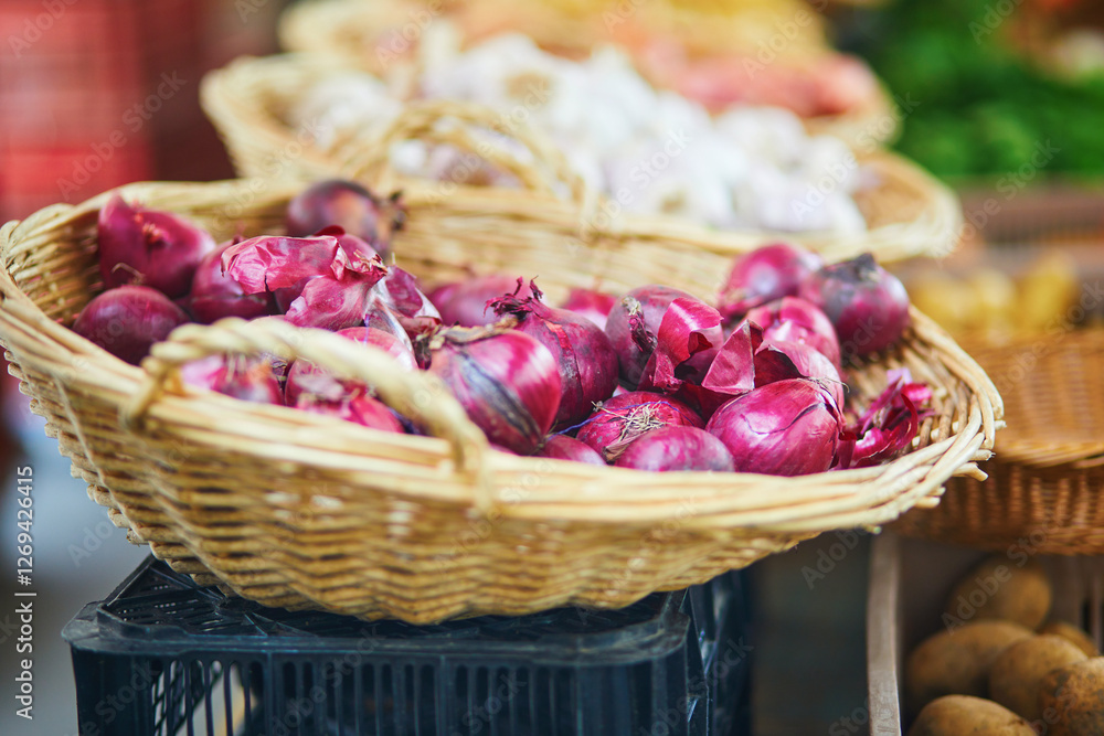 Fresh organic onion on farmers market in Paris, France.