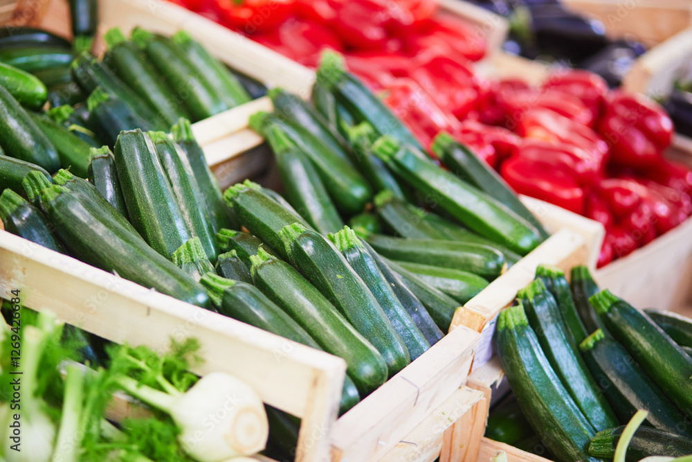 Fresh healthy bio fruits and vegetables on farmer agricultural market in France.