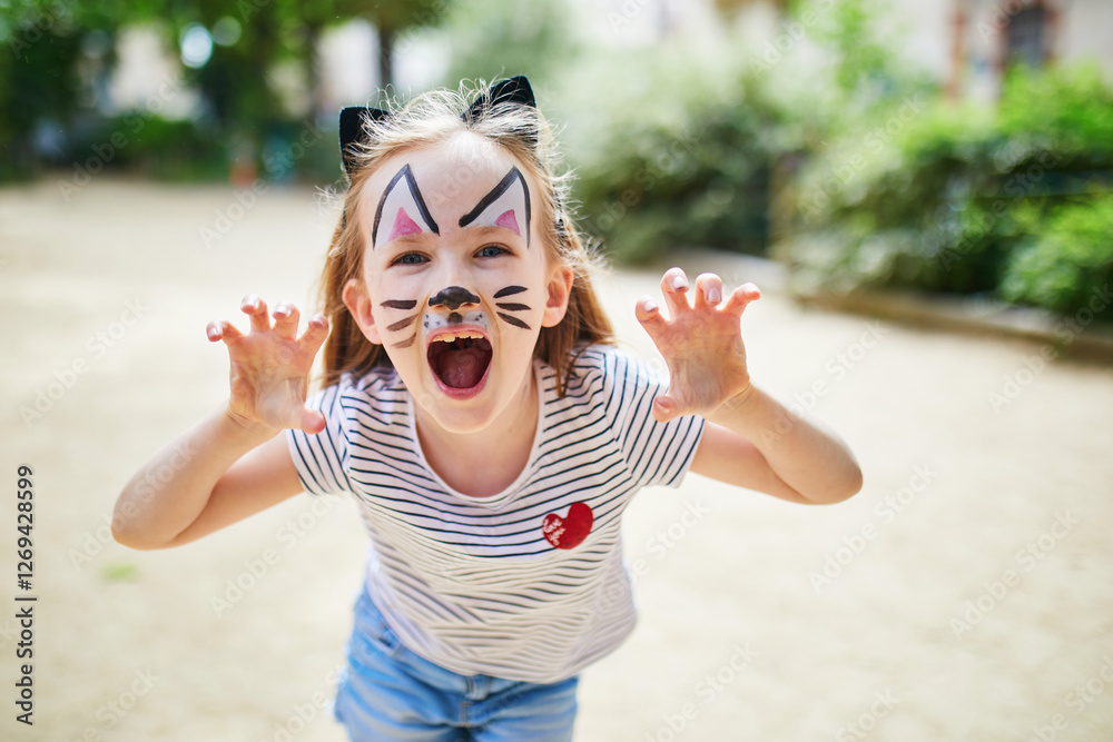 Little preschooler girl with cat face painting outdoors. Children face painting. Creative activities for kids.