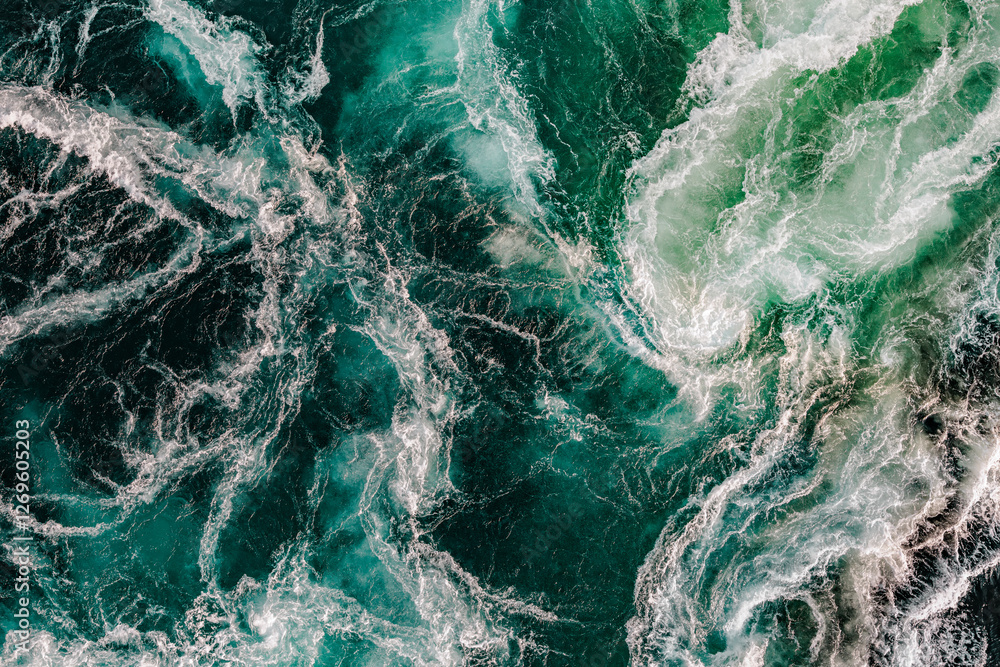 Blue waves of water of the river and the sea meet each other during high tide and low tide.