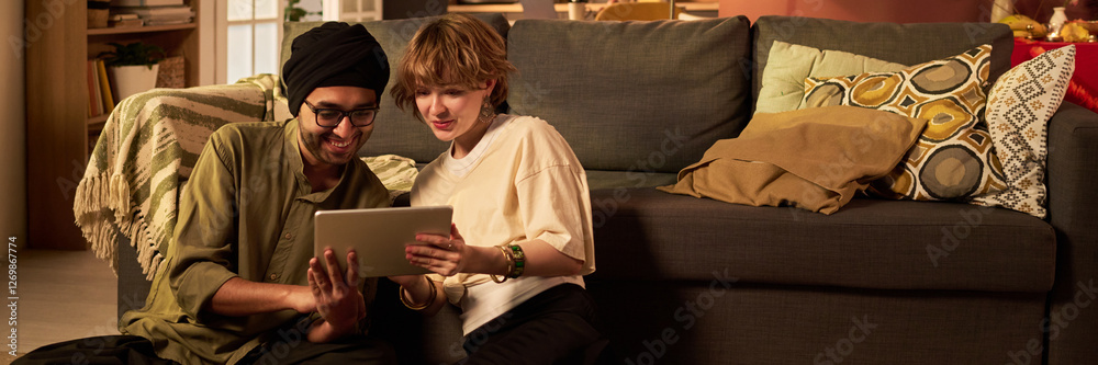 Two friends sitting on floor using tablet in warm and cozy living room environment. Smiling and focused while bonding over technology, surrounded by comfortable cushions
