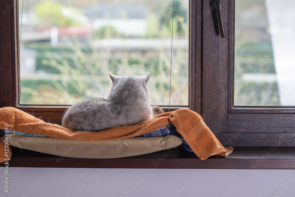 gray cat sleeping peacefully on orange blanket on hanging bed on windowsill, warm and cozy atmosphere emphasizing comfort and relaxation, pet living in house,