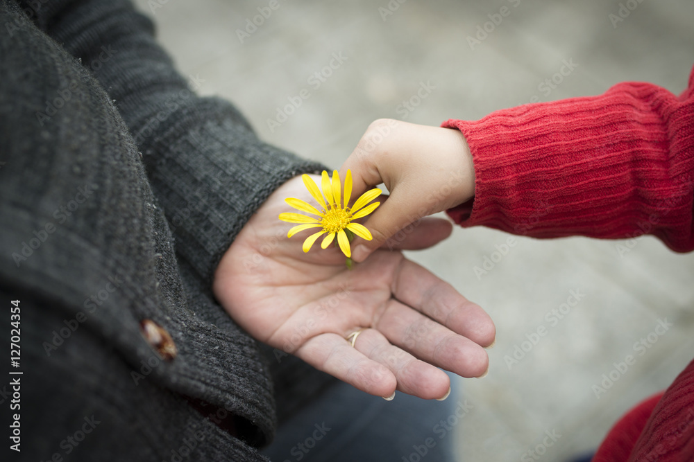 黄色い花を手渡すお婆ちゃんと孫娘の手