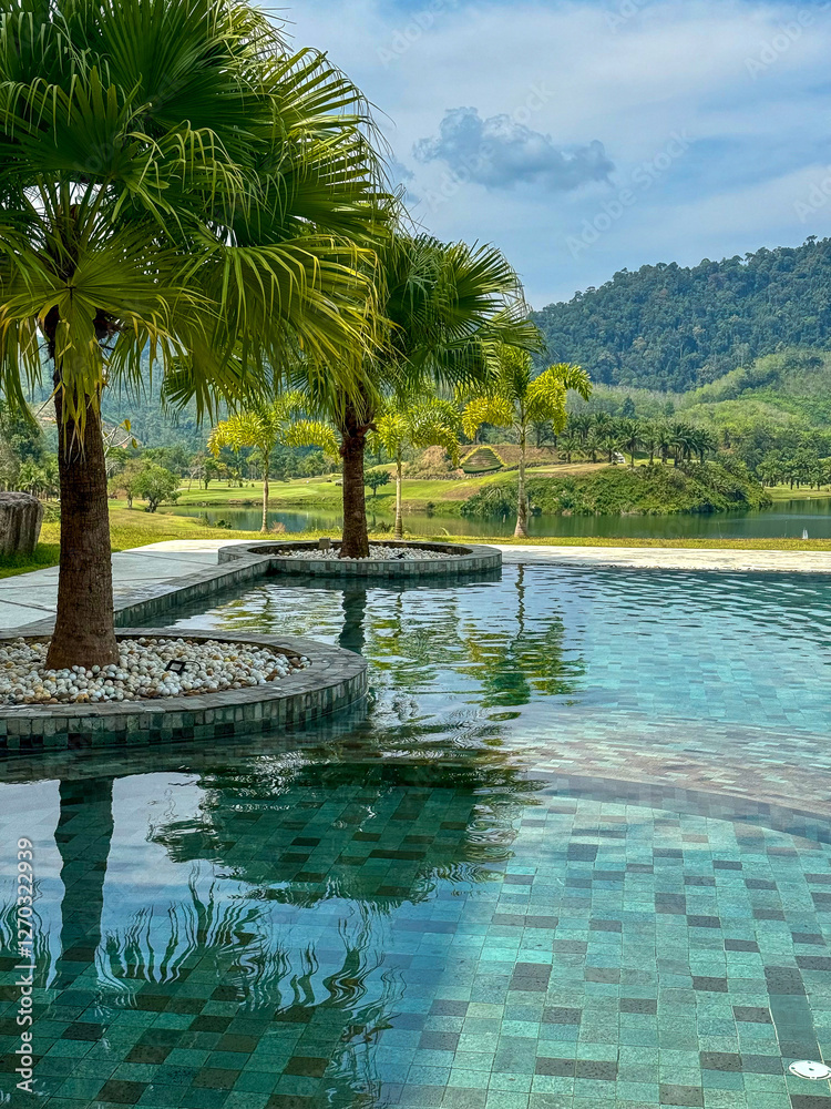 Infinity pool with a view of a tropical landscape