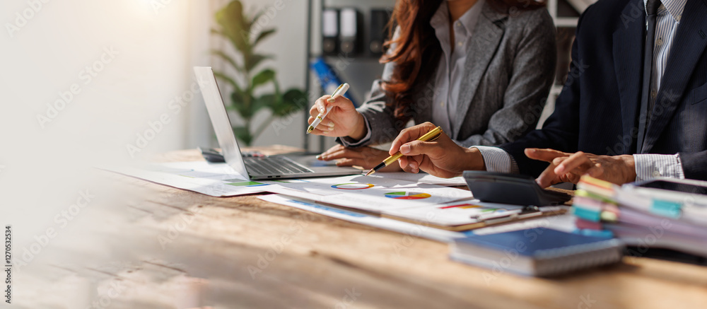 Title: Businessman team working at office with document on his desk, doing planning analyzing the financial report, business plan investment, finance analysis concept. Economic business discussions.