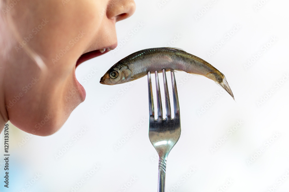 sprat in the hands, salty and fresh on white background. open mouth is eating fish.