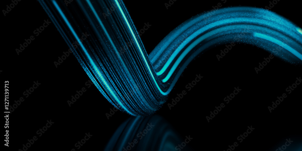 3d render Abstract Flowing Blue Light Trail on Black Background with Reflection