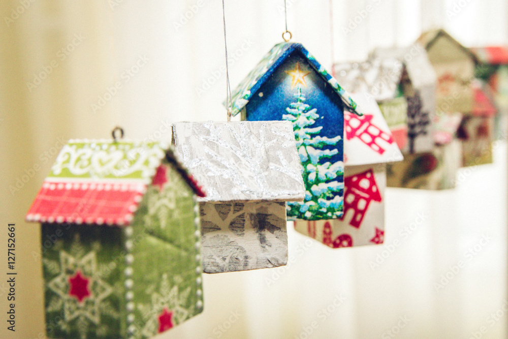 Fir tree decoration: handmade houses with Christmas ornaments