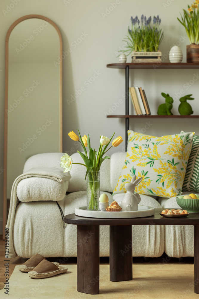 Sunny and design interior of living room with easter decorations, tulips, modular sofa, shelf, pillows and elegant accessories. Home decor. Easter holidays.