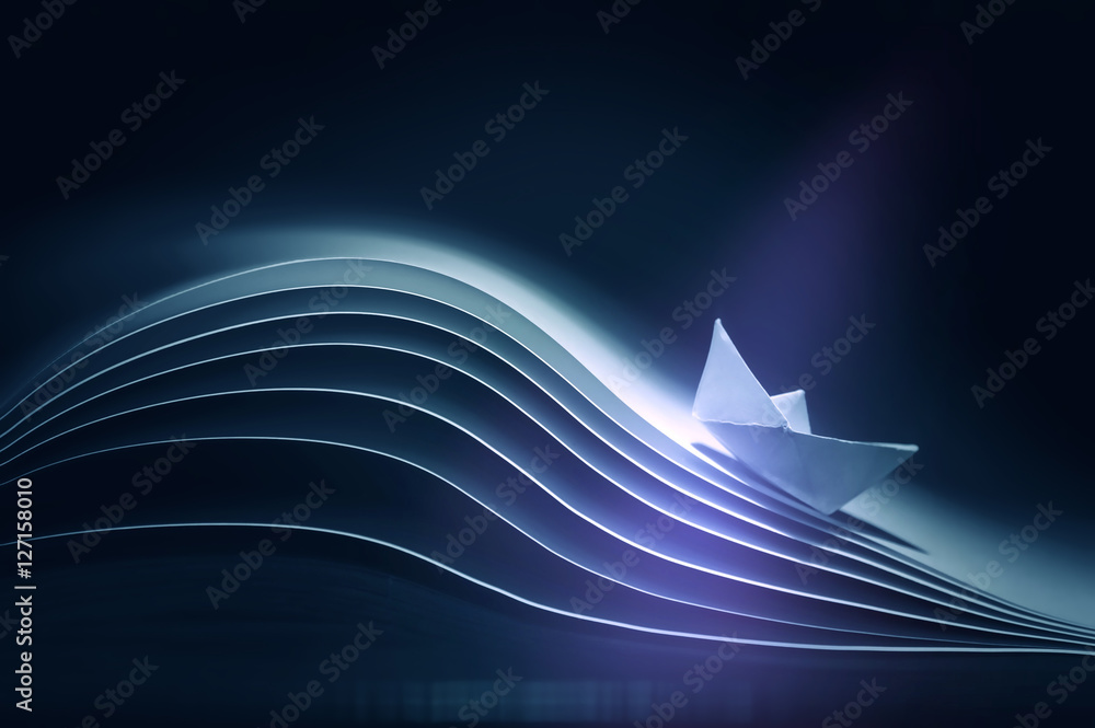 White paper boat floating on the waves of the book pages under beam of light on a blue background. Creative idea concept for travel, learning and knowledge. Beautiful dreamy artistic image.