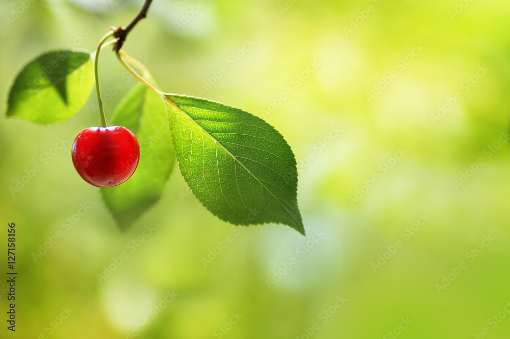One cherry on a branch with leaves in the sun on a beautiful soft green background. Background for postcards or design.