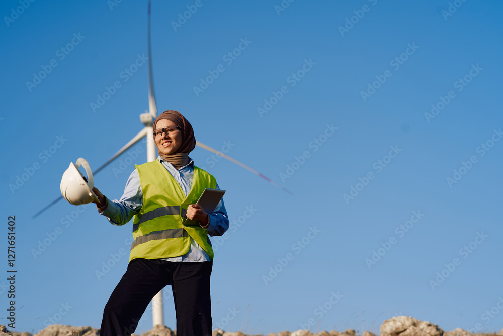 Muslim Woman Engineer Posing in Front of Wind Turbines for Electricity Generation.