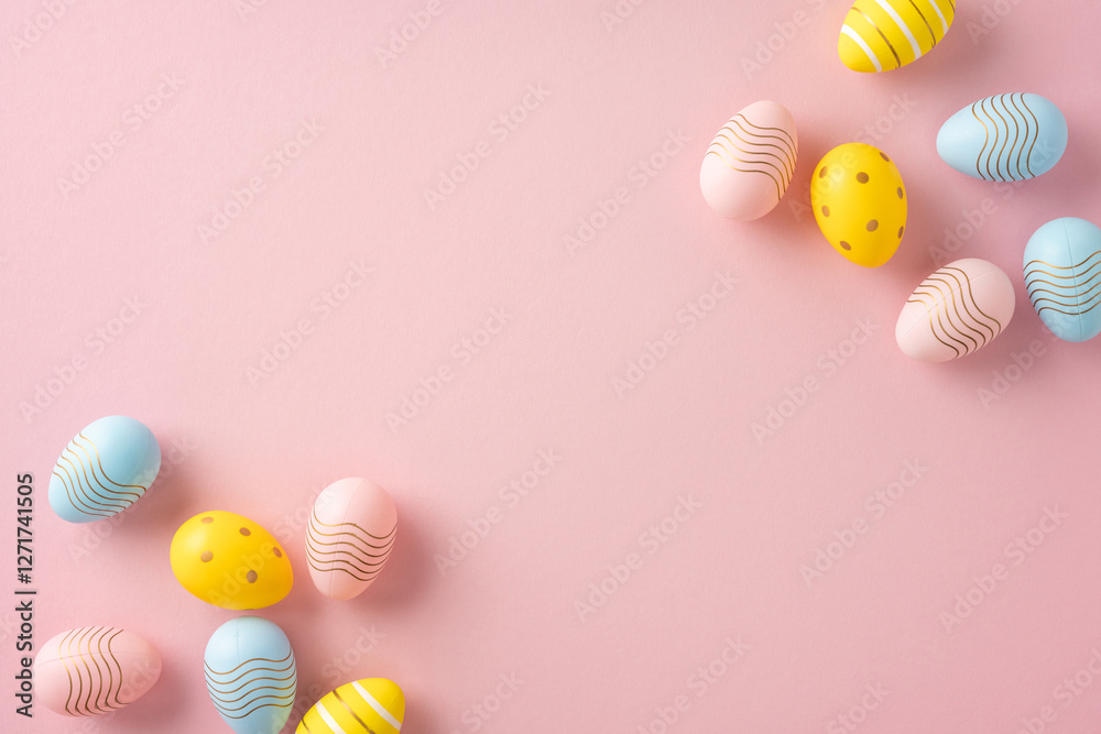 Decorative pastel-colored Easter eggs displayed creatively on a pink background symbolizing the festive spirit of Easter