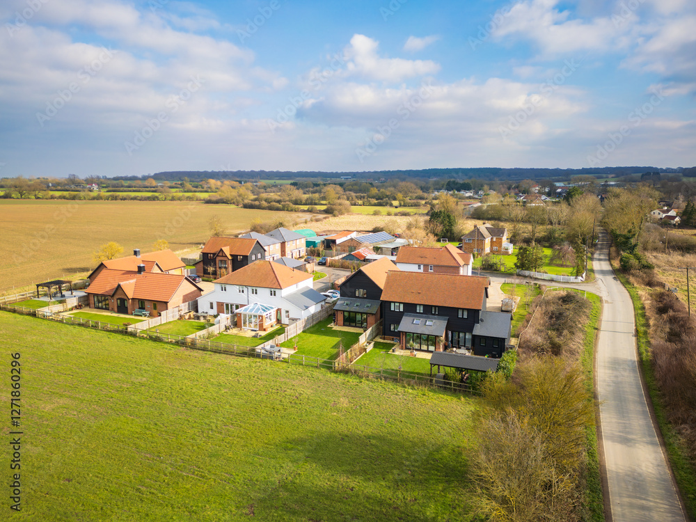 Aerial view of a small but exclusive housing development in rural East Anglia, UK. Once farmland, now sold to local developers.